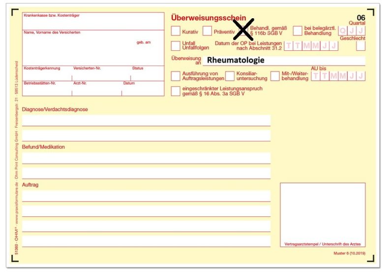 Für die Behandlung im ASV-Rahmen ist gesetzlich vorgeschrieben, dass eine Überweisung vorliegt. Diese Überweisung sollte den Hinweis auf §116b SGB V enthalten. Auch wenn es etwas bürokratisch erscheint, ist sie notwendig, damit wir die spezialisierte Versorgung durchführen können.